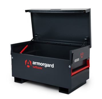 The Armorgard TuffBank site boxes are a heavy-duty construction site chest with a thick steel plate lid, ultra-robust 5-lever deadlocks with anti-drill plates and anti-cut rollers in deadbolt, with robust Chubb style keys. Fitted Gas struts for easy opening and closing.