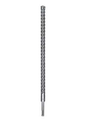 The SDS plus-5X Drill Bit offers highly efficient drilling in reinforced concrete. The geometrical form of the 4-cutter head prevents jamming and breakage for optimal results. The 'turn-angle' head and the large and short dust removal channels within the 4-flute design provide fast dust removal so the bit can slice through concrete and rebar quickly with reduced wear. For efficient work and exact hole diameters, the centring tip guides drilling from the start, to prevent wandering, which can falsify the hole diameter. The bit is intended for use on masonry, concrete and reinforced concrete. As proof of quality, the drill bit bears the test mark of the PGM Masonry Drill Bit Association Board, guaranteeing compliance with tight tolerances, exact drilling and the firm hold of fixings. It is compatible with rotary hammers with SDS plus holders.