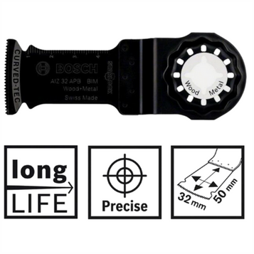 The Starlock AII 65 APB blade offers long life for wide cuts in wood and non-hardened metal. Its robust BIM (bi-metal) combination of an HCS (high carbon steel) blade and HSS (high-speed steel) teeth resists wear and heat in hard materials such as metal and in abrasive materials to ensure lifetime use. The blade's flat design reduces wobbling to ensure a controlled cut due to direct power transmission that minimises wear on the blade. Its rounded cutting edge (Curved-Tec) prevents tooth breakage and increases durability. This blade is intended for cutting door frames to length on the floor and plunge cutting in laminated panels. It cuts wood with non-hardened metal, soft plastic, plasterboard and wood with nails. The Starlock Snap-In mounting system allows fast blade removal and exchange within 3 seconds without having to touch the blade. The mounting system produces the highest power transfer thanks to a 3-dimensional tight-fitting connection between machine and accessory. Use this product with all Starlock, Starlock Plus and Starlock Max power tools as well as common multi-tools.