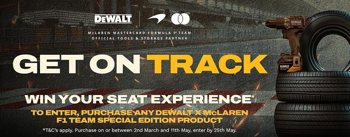 Purchase any DEWALT x McLaren F1 Team Special Edition product between 02.03.2026 and 11.05.2026 for your chance to win an exclusive McLaren driving experience at Silverstone. Open to UK residents aged 18+.