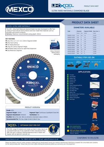 The UHX - Ultra Hard Materials diamond blade has been developed to offer fast cutting of hard natural stone products and man made fired materials such as porcelain and ceramic products. The performance of this blade can be attributed to its ultra thin 1.2 / 1.4 / 1.6 / 2.0mm castellated design turbo segment enabling not only fantastic cutting performance but also a super clean cut with a huge reduction in chipping.